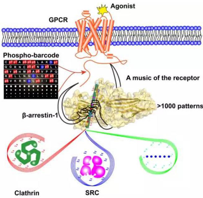 而另一种1-5 音符可以激活SRC,促进细胞的迁移等。考虑到10 个磷酸化位点 的组合可以带来超过1000 种变化(210-1=1023),因此受体C 末端不同的磷 酸化花样就可以引起超过1000 种Arrestin 的特异性构型;受体在理论上可 以通过Arrestin 启动超过1000 种信号途径。这个新的磷酸化编码理论可以 部分解释长期以来的一个悬而未决的问题:人体内超过800 个GPCR 如何利用 仅有的24 个效应器蛋白(20 个G 蛋白,4 个Arrestin)行使多种多样的 (>10000 种)细胞功能。这一研究也将为今后人们更好的设计基于GPCR 的药 物提供指导。